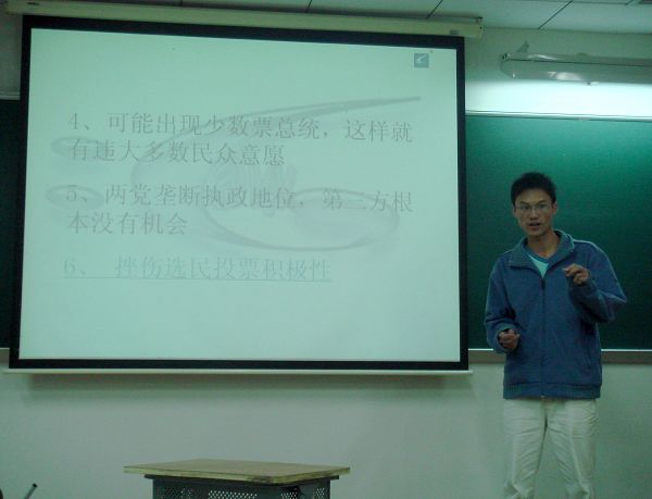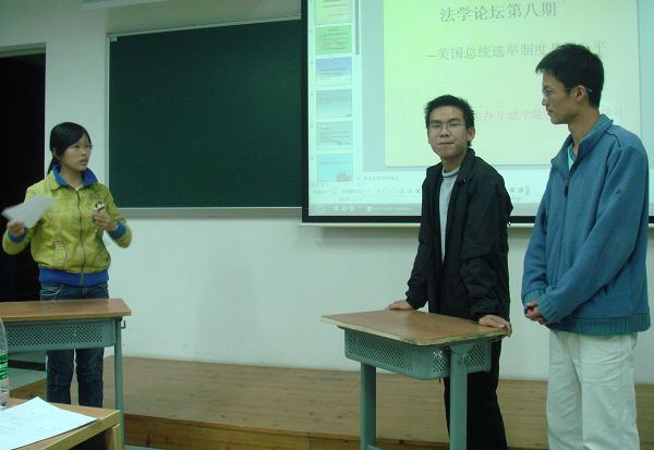 随后的“我有话说”的环节也一直围绕这个主题来展开。支持美国总统选举制度公平的同学认为,美国的选举制度能保护小州的利益,可通过选举立即产生总统,可避免因长时间的选举而导致政治分肥和交易,此选举制度也避免产生小党,使美国的宪政保持稳定。这种制度是适合了美国的国情,在服从多数的前提下,也尊重了少数人的意愿。
