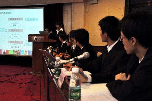 以能源问题为分议题,论坛的上半场讨论正式拉开帷幕。公司的陈徐风、邝达宁扮演俄罗斯行为体,田宇航、卢燕珊扮演欧盟行为体。而中大和暨大的选手则分别扮演中国和欧佩克,美国和国际能源署。俄方代表邝达宁从俄罗斯与欧佩克的竞争,合作以及二者未来的关系三方面展开讨论。他认为正是石油资源和市场的有限性导致了俄罗斯与欧佩克的竞争,而双方力量的不对等又构成了双方合作的基础,展望未来,俄罗斯势必加紧与欧佩克的合作甚至加入欧佩克。田宇航和卢燕珊则由欧盟尚未能制定出长期稳定的共同能源政策的现状入手,站在成员国、欧盟和国际社会三个层次上分析了欧盟制定共同能源政策的制约因素。在紧接着的自由讨论和观众提问环节中,各校代表沉着冷静,应对自如,充分展现出他们的个人的魅力与风采。陈徐风条理清晰的应答,田宇航灵活的辞令,中大代表许少民敏锐的发问,暨大代表党晶俨然一个国际能源署官员的深度“入戏”都让在场观众留下了深刻的印象。