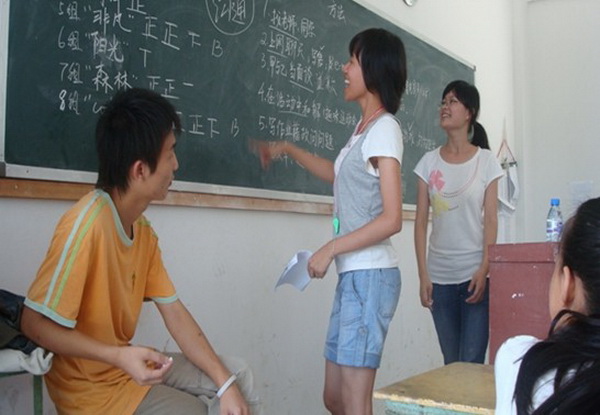 开始上课后,我先给他们做了一个趣味心理小游戏,内容是:“从脱鞋方式见你的人际交往”。公布了每个选项所对应的“受欢迎指数”后,便由此引入正题,然后重点讨论在人际交往过程中,如何消除误会产生的矛盾。这时由员工上演情景剧(之间挑好人选来排情景剧的)。在观看完情景剧后,由各个小组讨论,在这种情况下,应如何消除同学与同学之间的矛盾。