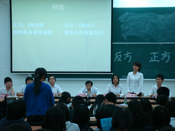 第二场辩论赛中 08法四对抗08法三的同学,他们的辩题是预知未来是幸福还是痛苦的。