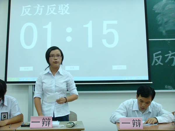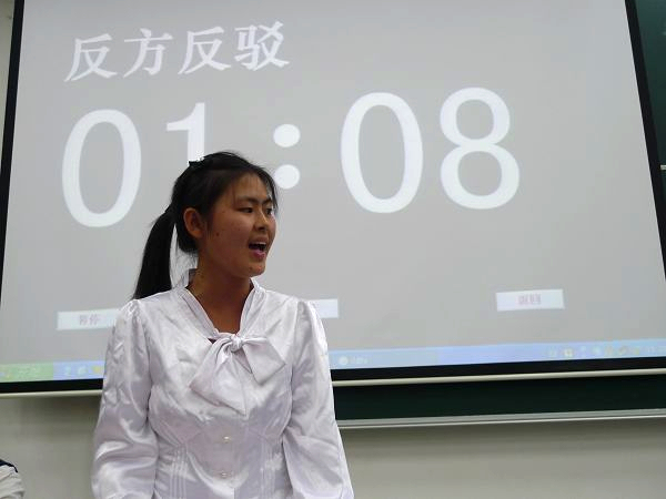 接下来是激烈的攻辩反驳环节,双方针锋相对,首先是正方二辩发问,她提问的是反方二辩,而反方二辩 幽默的语言、丰富的肢体动作都给观众留下了很深刻的印象。而正方二辩有条不紊的反驳、口若悬河的架势更是博得现场观众的一阵阵掌声。紧接着是最精彩的自由辩论环节。各方每个辩手轮番上阵,都企图在这个环节上占取优势,抓住对方辩词上的漏洞,由于战况激烈,观众们也不时给予热烈的掌声鼓励选手们。