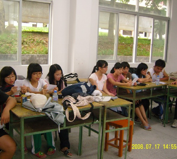 2008年7月26日,我们的大日子,十多天的努力终于要在这一天华丽上演啦。为尽量减少突发状况,我们在前一天晚上就组织队员进行了一次模拟演出,当天上午更是召集人马进行全真彩排。虽然场地很小,但催场人员、现场维持秩序人员、技术人员一个都不少,会场布置、演员道具也是毫不马虎,效果嘛,自然不言而喻,简直棒极了!用我们队长(委员长)宝佳同学的话来说,就是“En…good”。