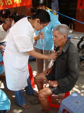 刚摆完不久,就有好多人来量血压,镇上和村里的就是不一样,人们相对比较重视,一下子量血压的地方就挤满人了,还得维持一下秩序--排队,呵呵。莹仪姐和美珍姐主打,忙得不亦乐乎。那些带着施工帽的中年叔叔不停地说:“还是好人多啊,你们这些老员工真好!”还有一个我帮他按摩的叔叔说:“要是你们一年能来几次,那多好啊!”“可惜我们只是三下乡,不是实习生,呵呵。”