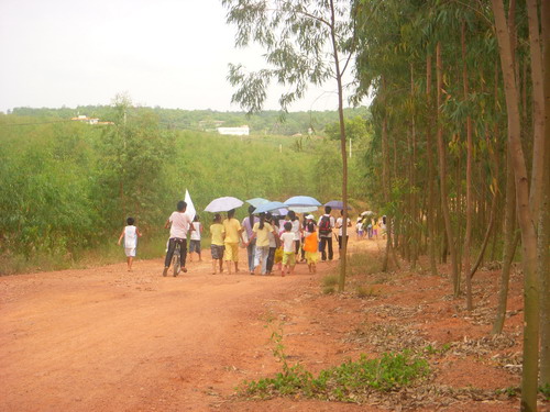 出发的时候孩子们送我们走过那段用时30分钟的山路,有骑单 车为我们拿东西和扛旗的,有小小个嚷着 帮我们拿行李 的,也 有回家骑摩托车让师兄师姐们载走得慢的。一路上,爱的翅膀和朋友的旋律不停地响起。路边,堆着我们的行李,