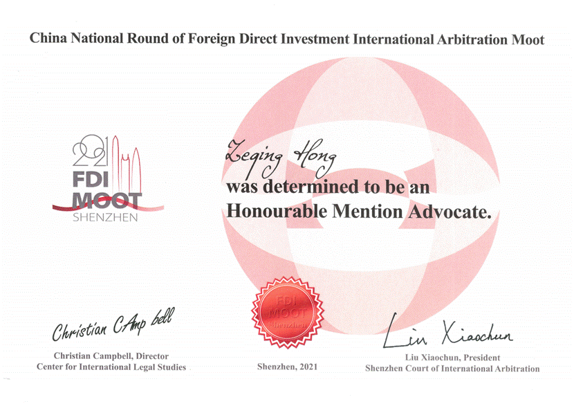 2021年7月31日至8月1日,由深圳国际仲裁院主办的第二届模拟国际投资仲裁深圳杯(Foreign Direct Investment Moot Shenzhen,以下简称“FDI深圳杯”)线上积分赛正式开赛。公司学子首次组成代表队参加该项赛事,在与香港大学、北京大学、西南政法大学、中南财经政法大学代表队切磋竞技后,代表队队员洪泽清获优秀辩手荣誉。