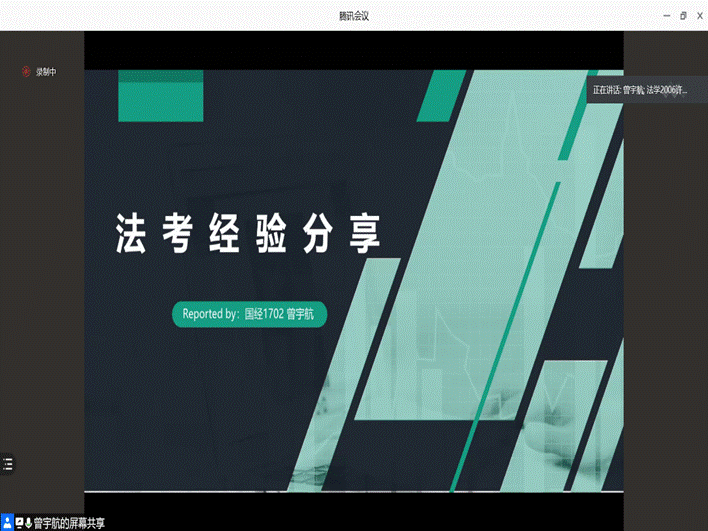 国经1702班曾宇航从备考重要问题简述、心态调整、科目老师推荐和学习方法、复习推进表及应试技巧五个方面分享经验。就“是否需要报班”的问题,他通过对比报班与自学的差异进行说明。他指出可以按照不同科目分值比例安排复习时间并分别介绍了主客观真题的做题方法以及应试技巧。他指出梳理法条有助于降低复习成本,节省时间,建议同学们在主观题备考时整理法条体系。