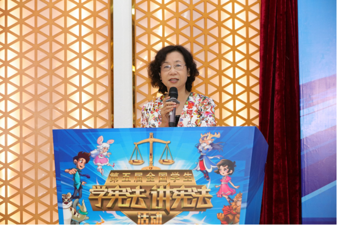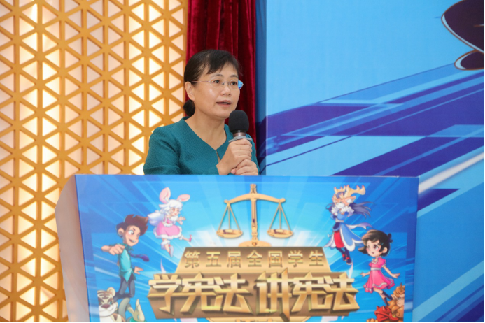 广东省教育厅副厅长那佳代表广东省委教育工委、省教育厅发表了热情洋溢的开幕致辞。她首先对来自全省的参赛选手及澳门特别行政区的特邀选手、指导老师表示热烈欢迎。她总结了我省在历届全国“学宪法 讲宪法”活动中取得的优异成绩,并指出,此次活动在全国新冠疫情防控工作取得阶段性胜利的背景下举行,是青少年普法教育工作的一项重要活动。她认为,32位选手脱颖而出晋级决赛,都是过五关斩六将、非常优秀,希望选手们把这次学习的收获,带回自己的班级、公司、家庭和社区,成为学法、守法、用法、讲法的使者,共同营造尊崇宪法、学习宪法、遵守宪法、维护宪法、运用宪法的社会氛围。最后,那佳副厅长预祝各位选手取得优异成绩,在全国赛场上继续展现广东风采。